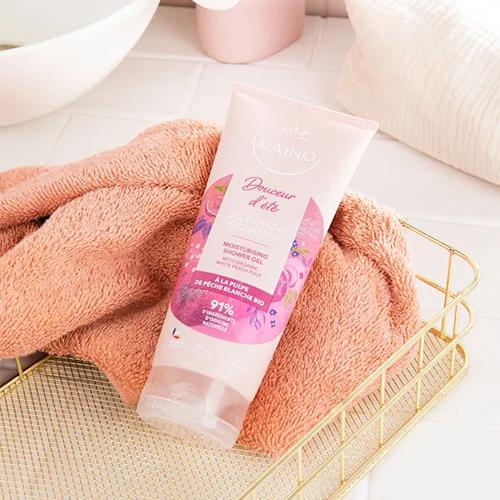 Laino duschgel med persikodoft är en mild och återfuktande duschgel som rengör huden skonsamt samtidigt som den ger en lätt, somrig doft av solmogen persika. Formulan kombinerar pulpe de pêche blanche (vit persikopulp) med fuktgivande glycerin för att rengöra, återfukta och lämna huden mjuk och fräsch.