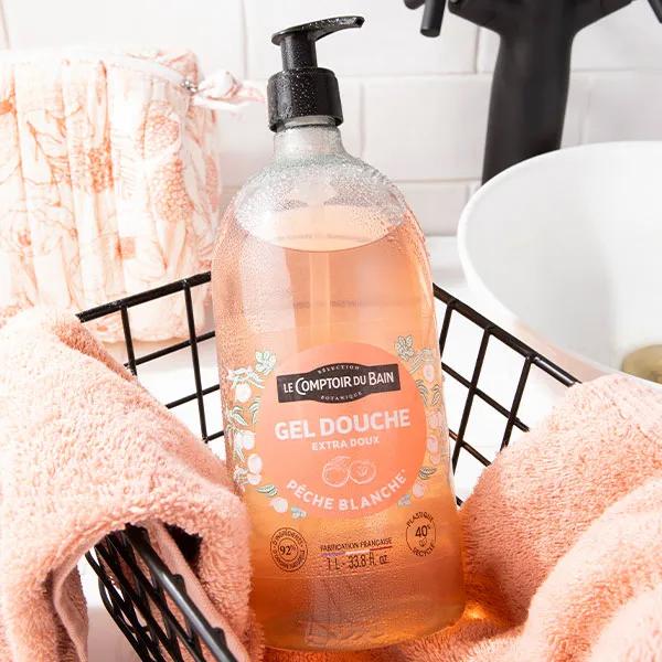 Le Comptoir du Bain extra milda duschgel med doft av vit persika är en skonsam duschgél för kropp och ansikte som passar även känslig hud. Den milda, sulfatfria formulan rengör effektivt utan att torka ut huden och respekterar hudens naturliga balans. Den är dessutom berikad med glycerin som hjälper till att bevara hudens fuktighet och lämnar en fräsch, fruktig doft med toner av persika, vinbärsblad och orkidé.