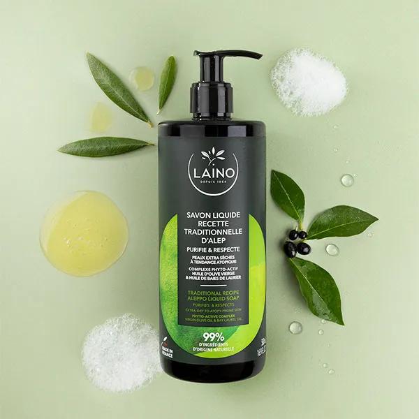 Laino flytande Aleppotvål 500ml med traditionellt recept är en mild och vårdande rengöring för kropp och händer, baserad på det klassiska Aleppo-receptet. Tvålen är tillverkad med extra jungfruolivolja och lagerbärsolja 20%, vilket ger en skonsam rengöring som inte torkar ut huden och hjälper till att bevara hudens fuktbalans.