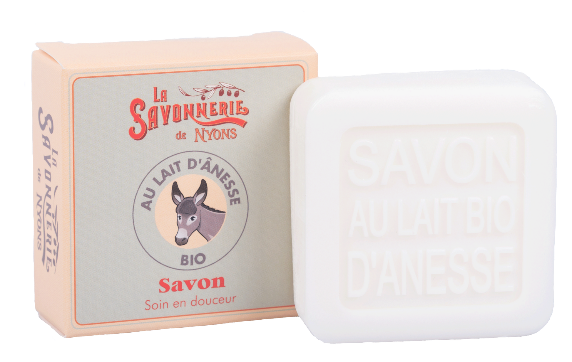 Ekologisk åsnemjölksdoftande tvål på 100 g som är berikad med ekologiskt sheasmör och olivolja från Frankrike – två ingredienser med mjukgörande och skyddande egenskaper. Den innehåller också ekologisk åsnemjölk, känd för sitt höga innehåll av vitaminer, fettsyror, vassle och fosfolipider, samt sina hudvårdande och återfuktande egenskaper. Tvålen kan användas på alla hudtyper.